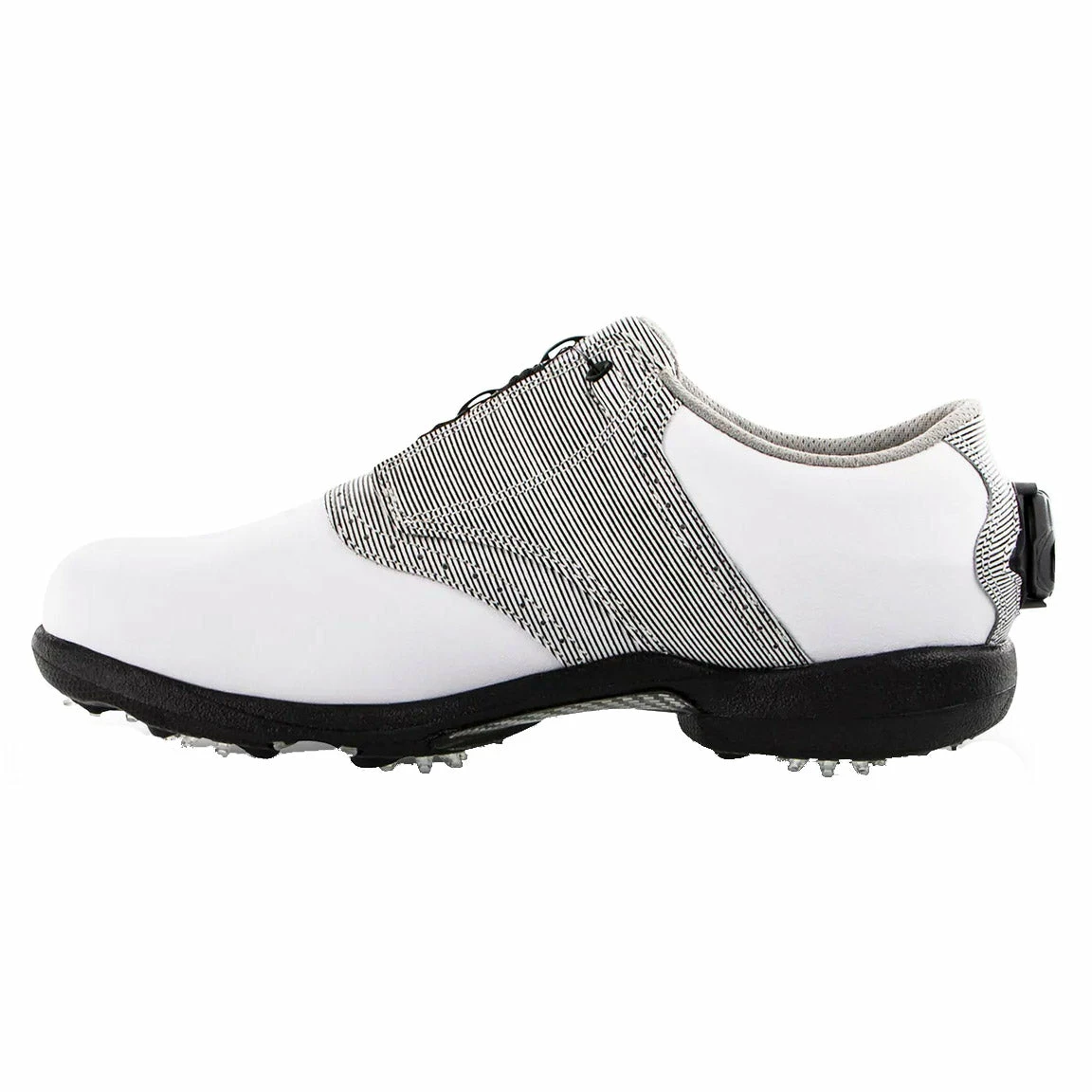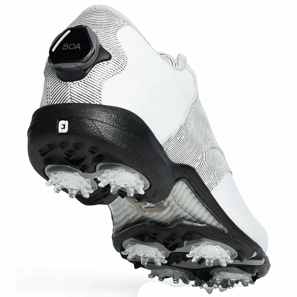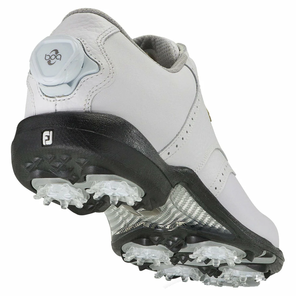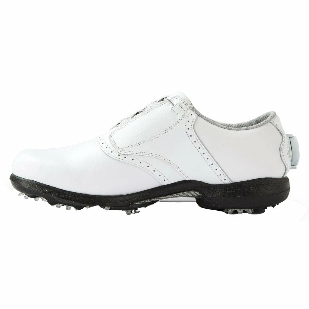 Tailored to fit female golfers comes the FootJoy DryJoys BOA Golf Shoes. These shoes provide waterproof protection during every round and the full grain leather upper will look and feel great while keeping your feet dry and comfortable. There is a TPU mid-foot stability bridge that allows you to swing confidently as it provides a stable base. The DuraMax rubber outsole gives you maximum grip on every terrain and the cleats can be removed and replaced.