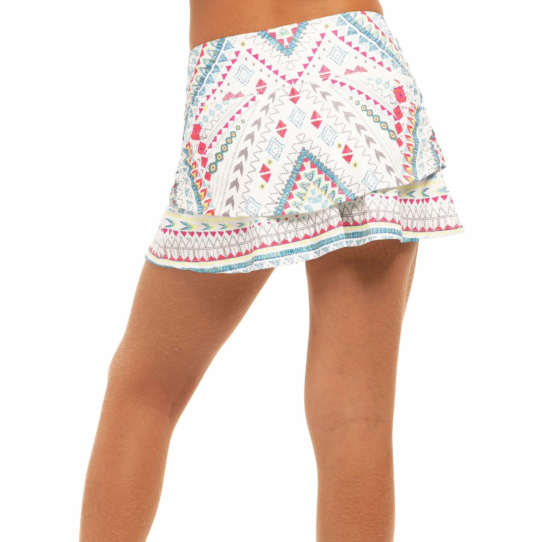 Get cute styling for the course with the Lucky in Love Desert Vibes Girls Golf Skort. This 11in skort features an all over engineer printed pattern, a wide, comfortable waistband, and a back pocket detail. Attached sky blue shorties provided added coverage while a tiered design offers a fun look.