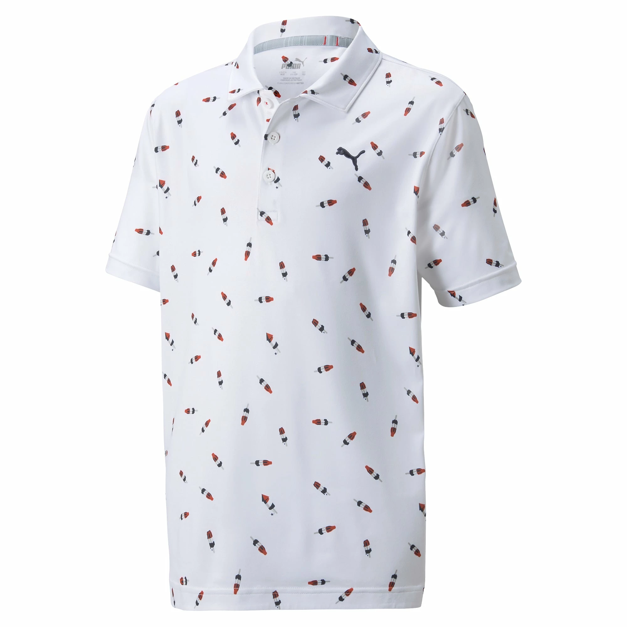 Have your kid looking stylish while staying comfortable in the Puma CLOUDSPUN Popsi-Cool Golf Polo. The Popsi-Cool polo is built with the super soft CLOUDSPUN fabric and dryCELL technology that pulls moisture from the body to keep you dry and comfortable throughout the entire round. The fun pattern of rocket pops and fireworks and a PUMA cat logo on the left chest work together to keep your kid looking good on and off the golf course.
